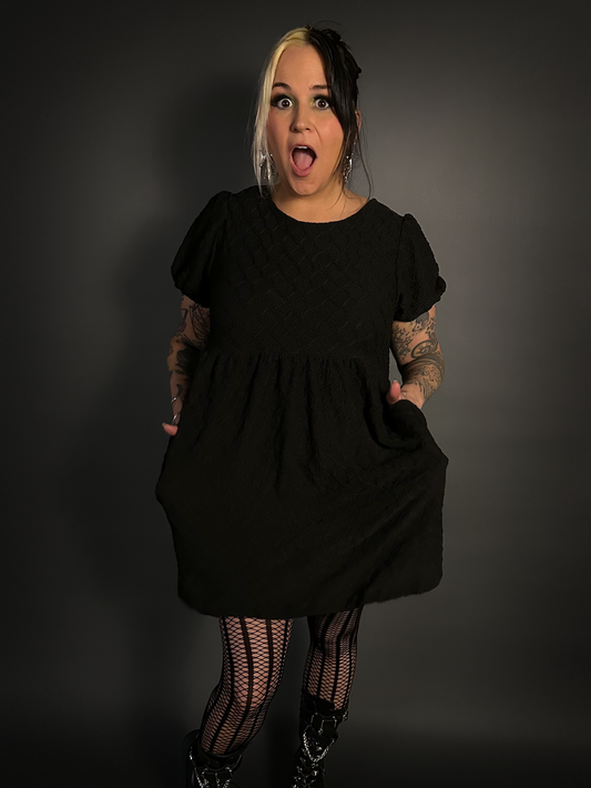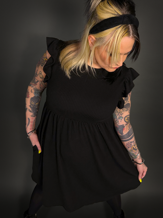 Butterfly Short Sleeve Ribbed Babydoll Dress with Pockets in Black