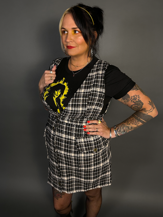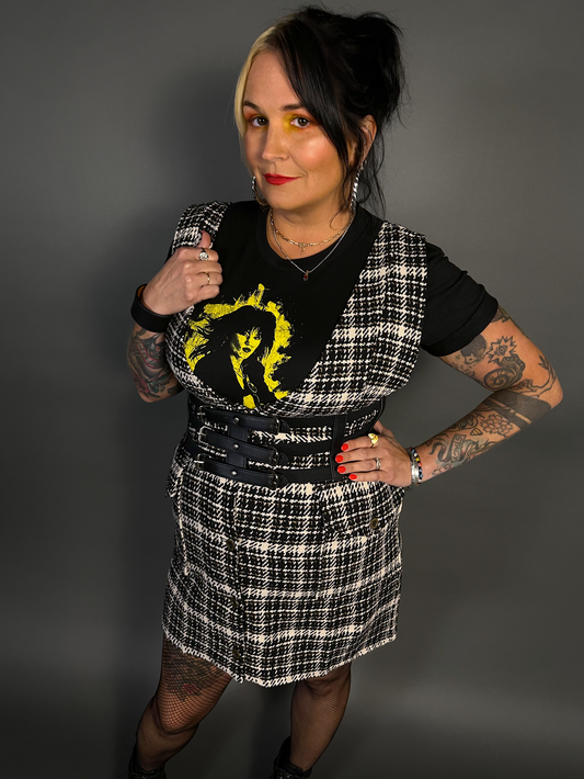 Outfit Set - Tweed Plaid Overall Mini Dress in Black/White & Three Buckle Corset Belt