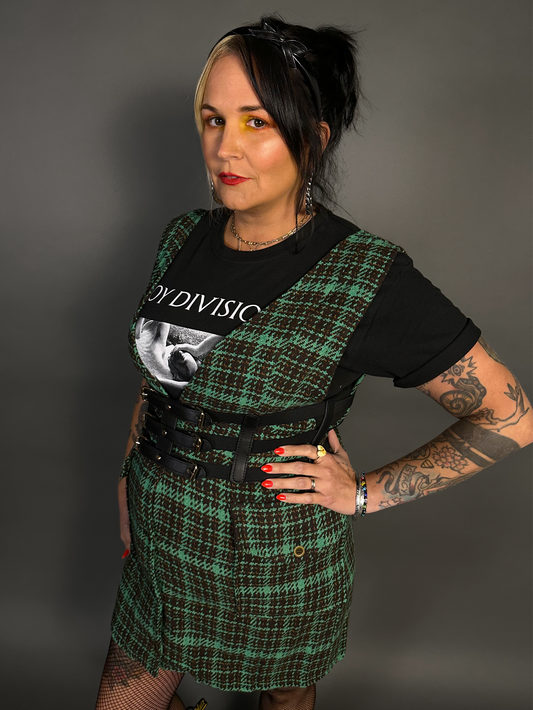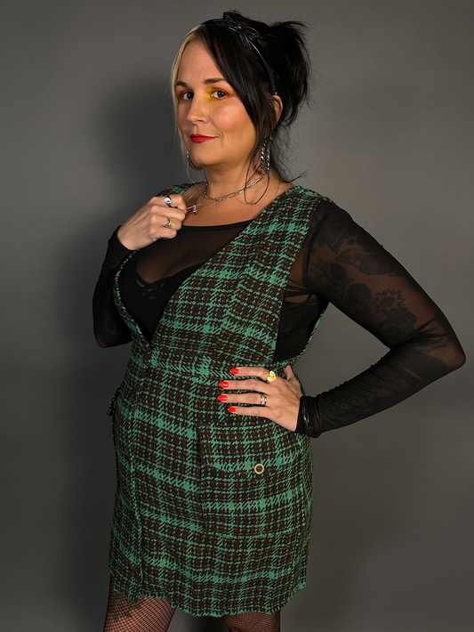 Outfit Set - Tweed Plaid Overall Mini Dress in Green & Three Buckle Corset Belt