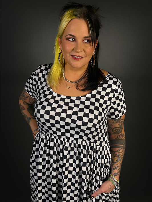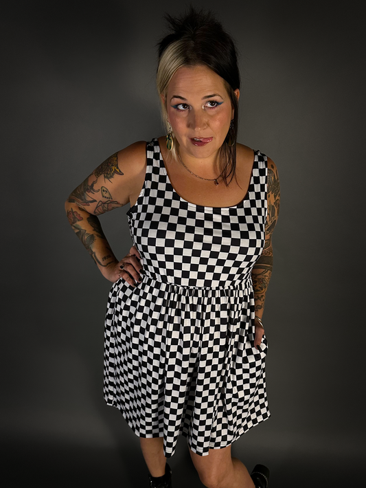 Tommyrot Checkered Short Sleeve Stretch Skater Dress with Pockets