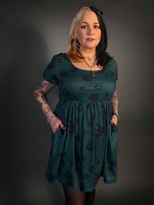 Tommyrot "Lady Luck" Short Sleeve Stretch Skater Dress with Pockets in Green