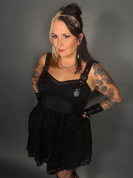 Tommyrot Lace Detail Corset Dress w/ Faux Leather Shoulder Straps in Black