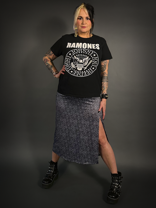 High Slit Animal Print Patterned Midi Stretch Skirt in Black, Blue, & Gray