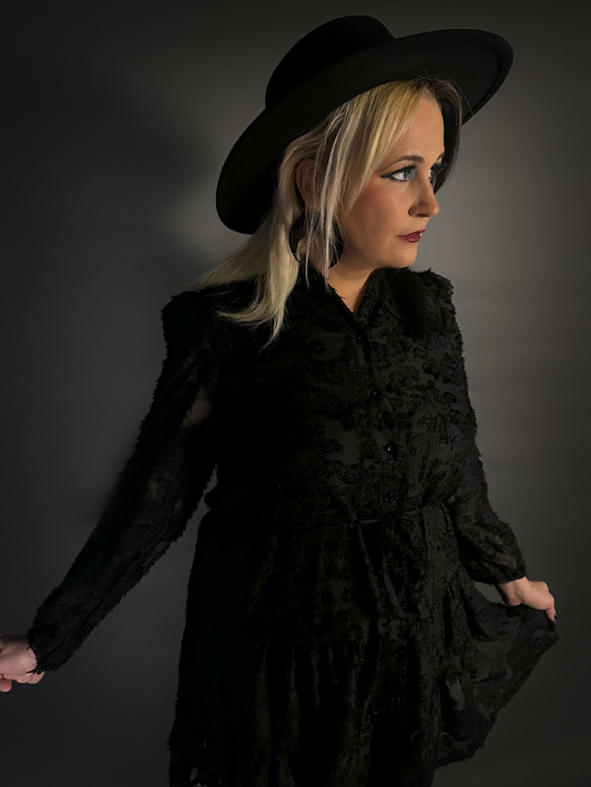 Long Sleeve Button-up Goth Dress with Fuzzy 3D Jacquard Lace in Black