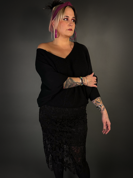 Mid-rise Two-layer Midi Skirt with Lace Overlay - Goth Style